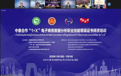 由泰国教育部职教委、全国电子商务职业教育教学指导委员会(中国)、“一带一路”电商谷项目建设发展理事会、清迈大学孔子学院和博导股份联合主办,宁夏工商职业技术学院等国内8所高职院校共同协办的中泰合作“中文+职业技能”项目“1+X”电子商务数据分析职业技能等级证书师资培训班于11月28日顺利开班。会议由中泰合作“中文+职业技能”项目合作委员会秘书长段建主持,泰国教育部职业教育委员会副秘书长孟佟•帕素万、中国驻泰国大使馆教育组一等秘书宋若云处长及协办院校代表参加了开班仪式。