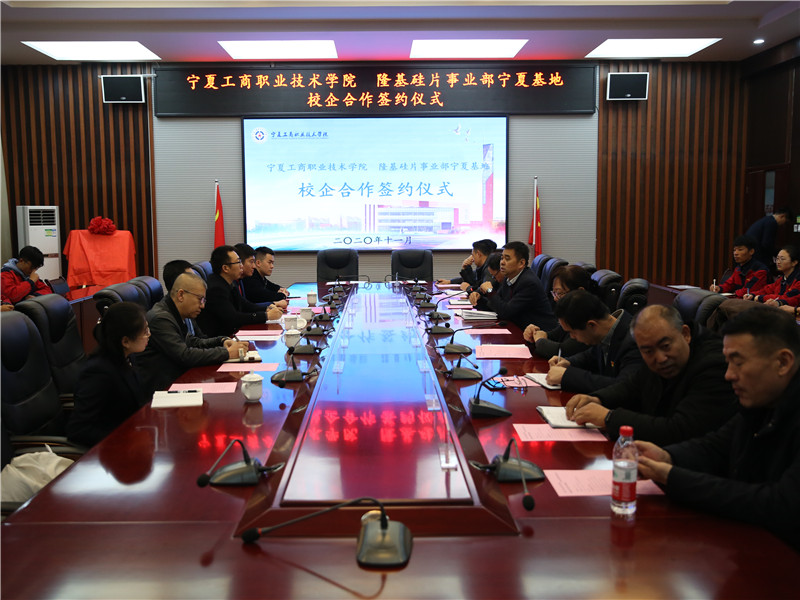 为进一步深化职业教育教学改革,全面推进产教深度融合,11月25日上午,“宁夏工商职业技术学院隆基硅片事业部宁夏基地校企合作签约仪式”在五号教学楼二楼会议室举行。学校校长关世春、副校长原秦英、周桂宁、隆基股份硅片事业部人力资源总监李嘉,人力资源经理刘海兵等领导,共同出席本次签约仪式。