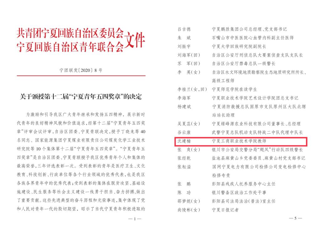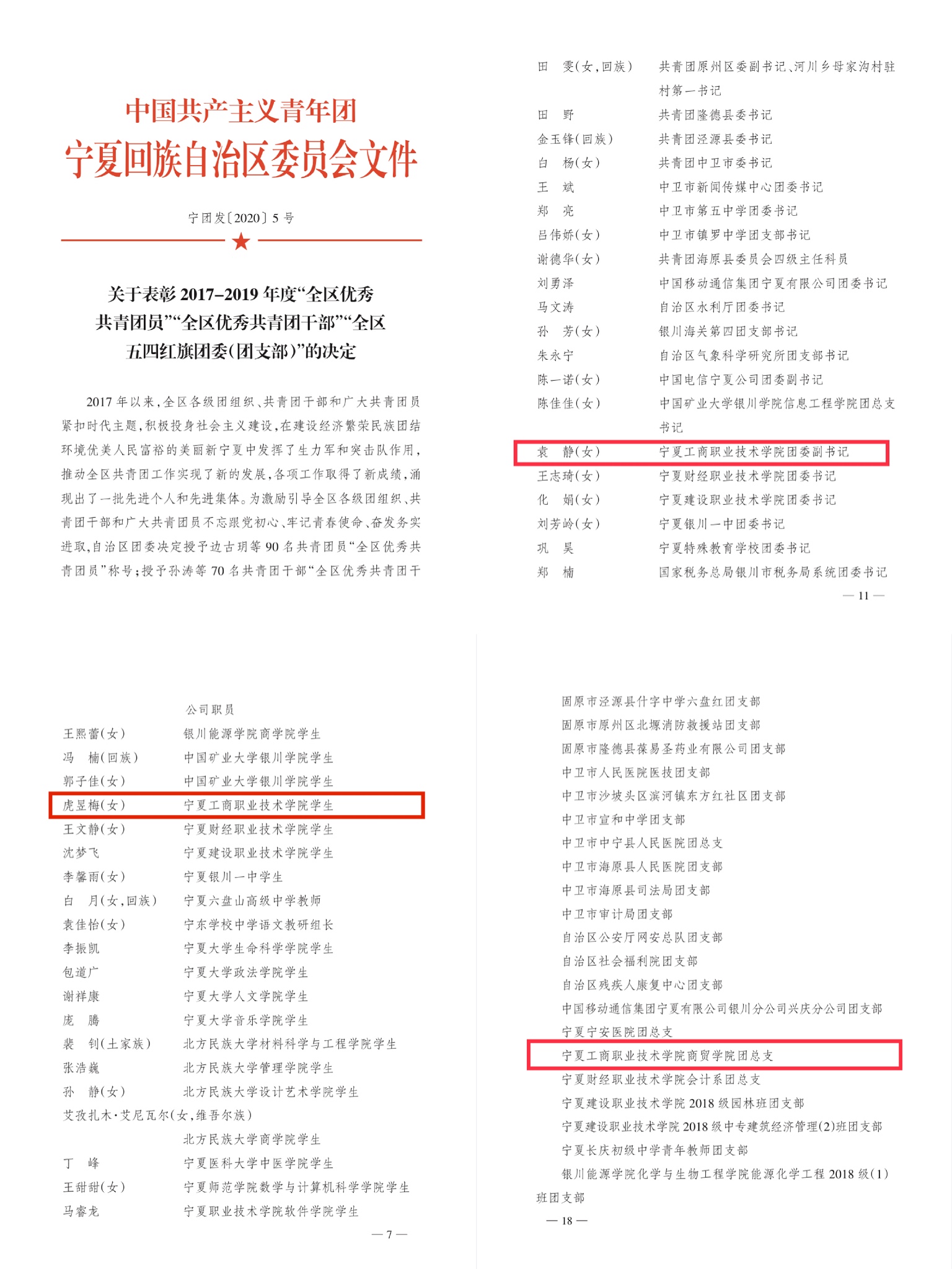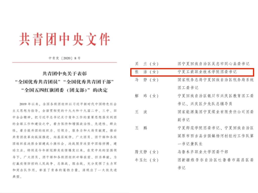 今年是五四运动101周年,我校师生用实际行动践行五四精神。教师张洁荣获“全国优秀共青团干部”荣誉称号、教师沈建楠荣获“宁夏青年五四奖章”、教师袁静荣获“全区优秀共青团干部”荣誉称号、学生虎昱梅荣获“全区优秀共青团员”荣誉称号、商贸学院团总支荣获“全区五四红旗团支部”荣誉称号。