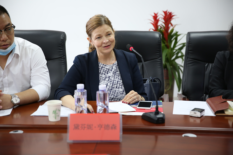 黛芬妮·亨德森女士表示,通过此次参访宁夏工商职业技术学院,对学校先进的教育理念、现代化的教学资源和雄厚的师资力量印象深刻,并对学校在职业教育办学方面取得的成果高度认可。随后就德国职业教育体系、双元制教育理念及DSD职业类德语考试项目进行了详细的介绍。