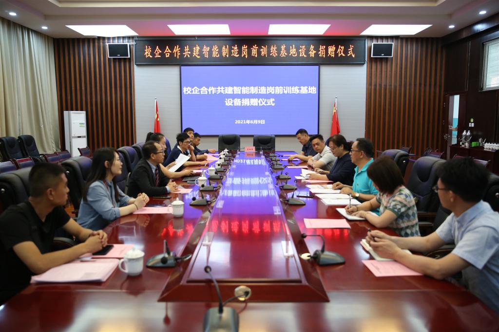 2021年6月9日,学校举行校企合作共建智能制造岗前训练基地设备捐赠仪式,副校长原秦英出席仪式,学校相关部门负责人及企业代表出席捐赠仪式,电气与控制工程学院院长施卫保主持了会议。
