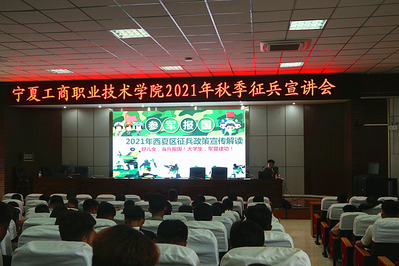 为进一步落实全国实行“一年两征”的征兵工作,加大本校征兵工作的宣传力度,正确引导在校大学生积极响应国家号召履行公民义务,学生处联合西夏区人民武装部于6月9日、6月16日在学校清风园报告厅组织开展了两场以“参军报国、建功军营”为主题的征兵宣讲活动。