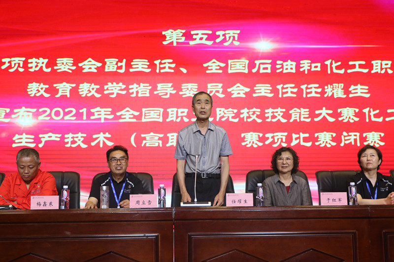 闭幕式最后,由赛项执委会副主任、全国石油和化工职业教育教学指导委员会主任任耀生宣布2021年全国职业院校技能大赛化工生产技术(高职组)赛项闭赛。