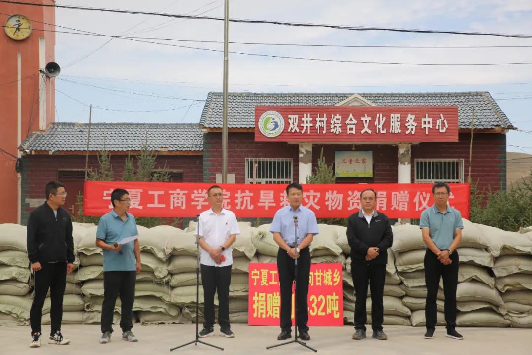8月25日,宁夏工商职业技术学院抗旱救灾物资捐赠仪式在海原县甘城乡双井村举行。宁夏工商职业技术学院党委书记陈晓军、学校办公室主任薛新巧、海原县乡村振兴局局长穆华、甘城乡党委书记妥成军与广大村民一同参加了捐赠仪式。
