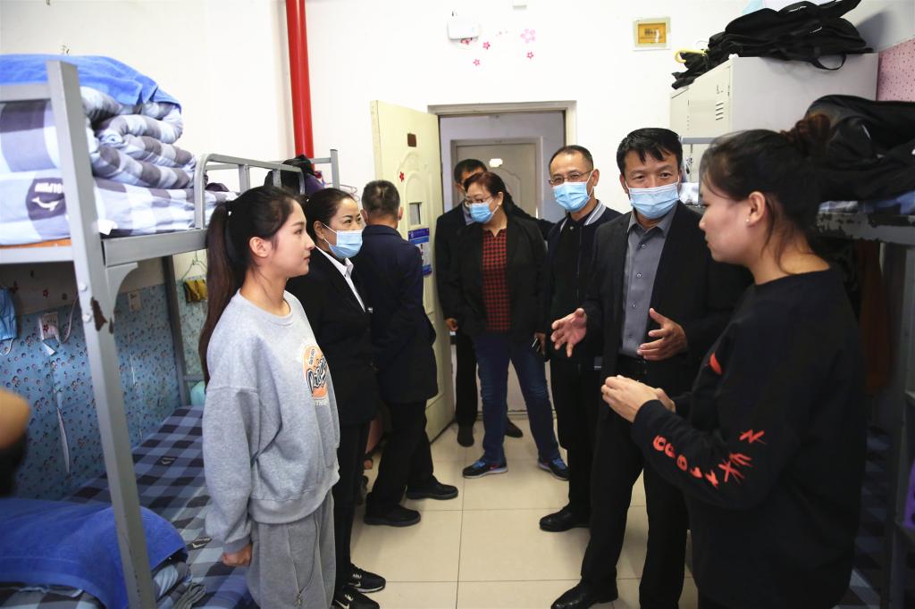 在学生宿舍,校领导与正在准备就餐的学生进行了交流,叮嘱同学们严格遵守疫情防控期间学校的各项管理规定,做好个人防护,保持良好宿舍卫生,在生活和学习上遇到困难时可以告知学校老师,学校会尽最大努力提供帮助,提醒同学们在疫情防控期间养成良好的生活习惯和积极的心理状态。
