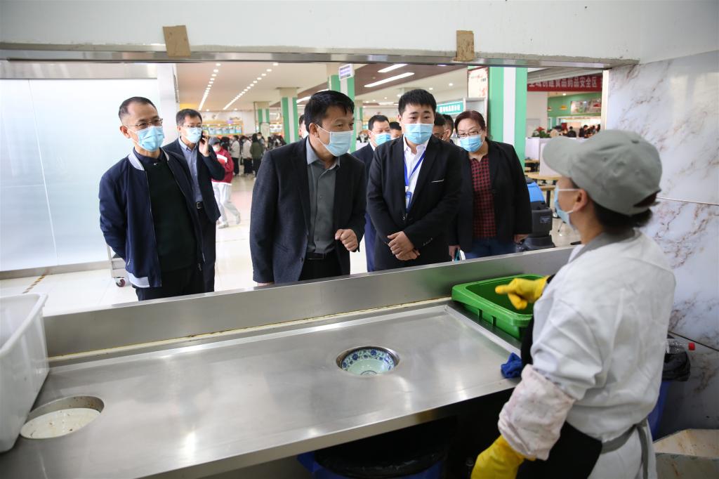 在学生餐厅,校领导查看了餐厅日常清洁、通风、消毒等情况,要求餐厅管理人员要加强食品安全重点环节的监督管理,特别是在食品原材料采购、食品生产加工操作、餐具洗消保洁及从业人员疫情防控知识培训等方面要切实将工作做细做实。