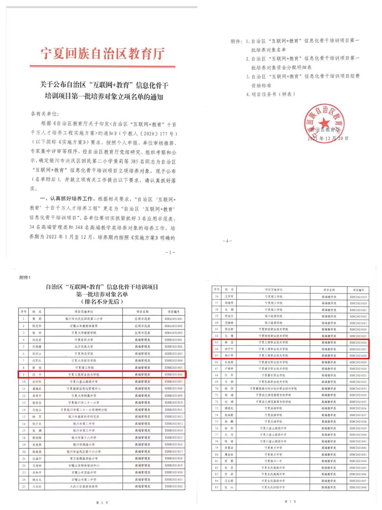 近日,根据宁夏回族自治区教育厅《关于公布自治区“互联网+教育”信息化骨干培训项目第一批培养对象立项名单的通知》,我校闫宁获批“互联网+教育”高端管理类项目,赫宜、邵宁平、杨小萍获批“互联网+教育”高端教学类项目。