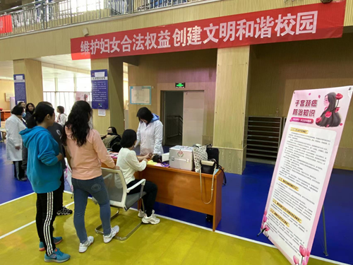 工作人员通过发放宣传资料、健康知识咨询和悬挂横幅等多种宣传方式,向广大女教职员工宣传了《中华人民共和国民法典》《女职工劳动保护特别规定》、《中华人民共和国反家庭暴力法》、女性常见疾病预防等知识。