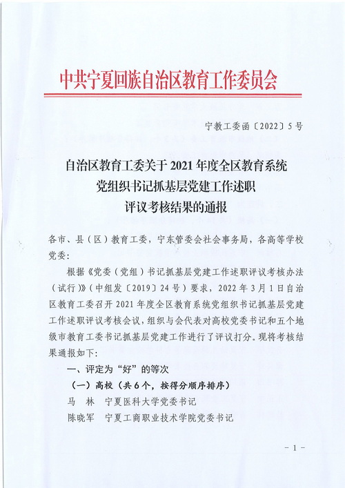 近日,自治区教育工委召开了2021年度全区教育系统党组织书记抓基层党建工作述职评议考核会议,校党委书记陈晓军同志进行了现场述职。经与会代表评议打分,校党委书记陈晓军被评定为“好”等次,在全区20所高校中位列第二,职业院校中位列第一。