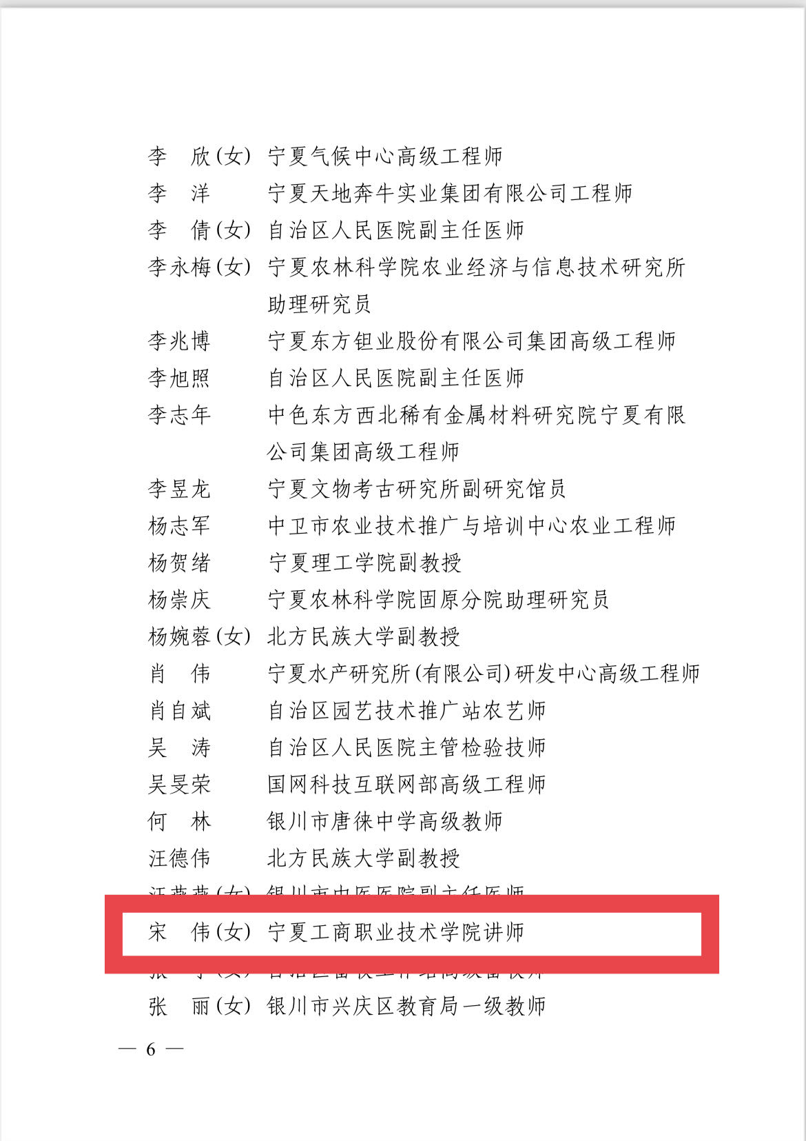 日前,自治区党委人才工作领导小组办公室 自治区人力资源和社会保障厅公布了2022年自治区青年拔尖人才培养项目入选人员名单,宁夏工商职业技术学院商贸学院教师宋伟入选2022年自治区青年拔尖人才培养项目。