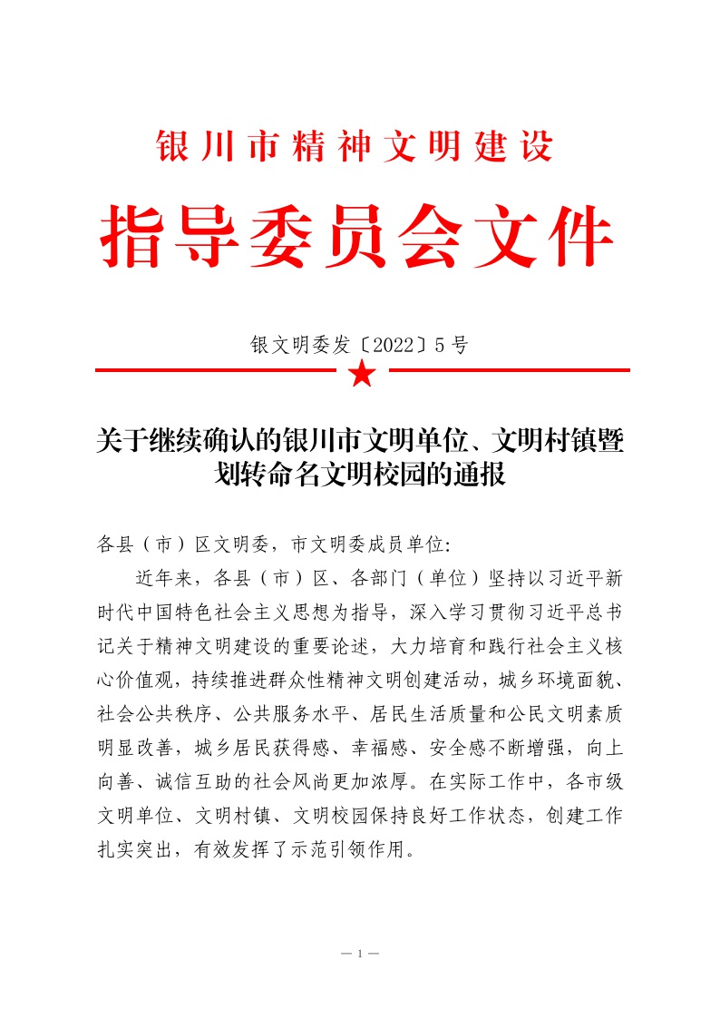 日前,银川市文明委第一次全体会议审议通过,公布了划转命名的8所获银川市文明校园荣誉称号的学校,宁夏工商职业技术学院荣获市级文明校园荣誉称号,本次继续确认的银川市文明校园届期自2022年开始。