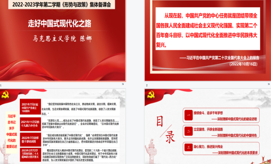 此次备课会以深入学习贯彻落实党的二十大精神为主旨,紧紧围绕教育部中宣部印发的《形势与政策》教学要点,推选教研室骨干教师陈娜,以专题《走好中国式现代化之路》为主题。此次备课从教学内容、教学重难点、教学目标、教学方法和手段、教学实施建议等多方面、多角度展开,主备教师以中国式现代化的理论逻辑和历史逻辑为出发点,结合宁夏区情,以动静结合的教学方法和手段,深入浅出从三个方面讲清楚中国式现代化的建设进程、中国特色和本质要求,脉络清晰、重难点突出、教学方法和手段灵活多样。