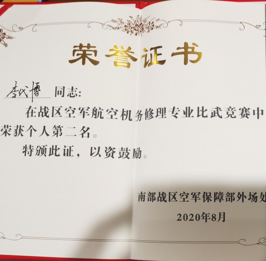 此次南部战区航空机务修理专业大比武竞赛中,有来自五个省区的本、专科院校士官生和部队多年从事机务修理工作的士官一起参赛,理论和实践技能相结合,全面考核专业理论实践综合素质。李代博同学用扎实的专业水平取得个人二等奖的好成绩,这是对我校士官生培养质量和教学质量的充分肯定,是对我校士官生培养工作的极大鼓舞。