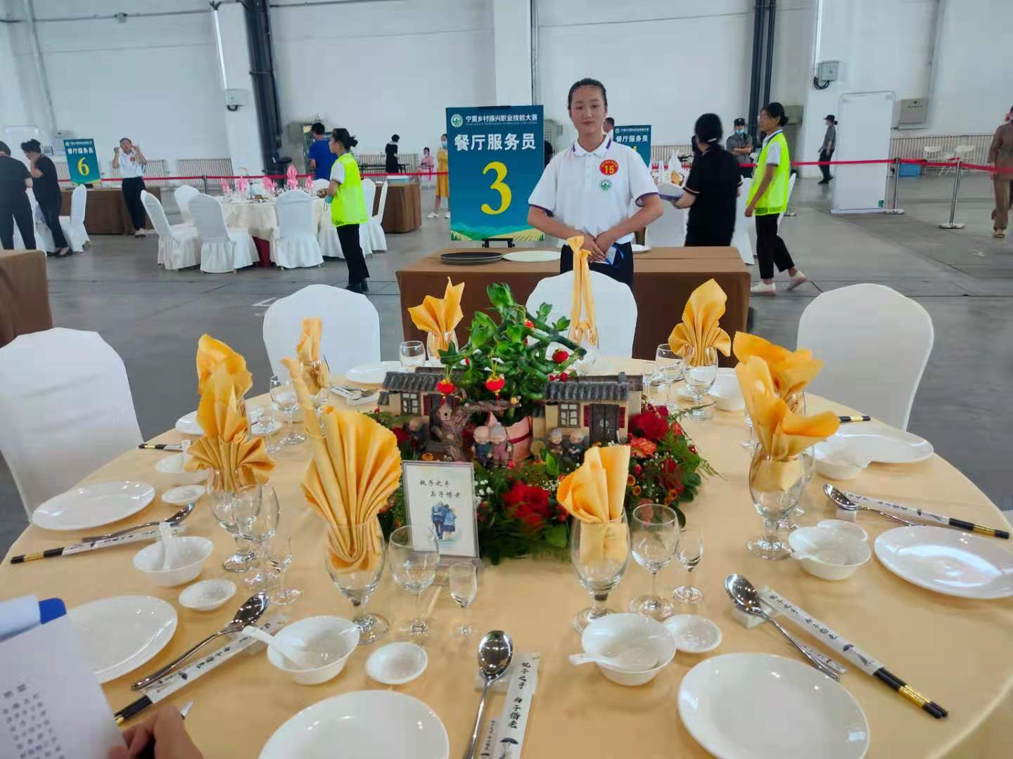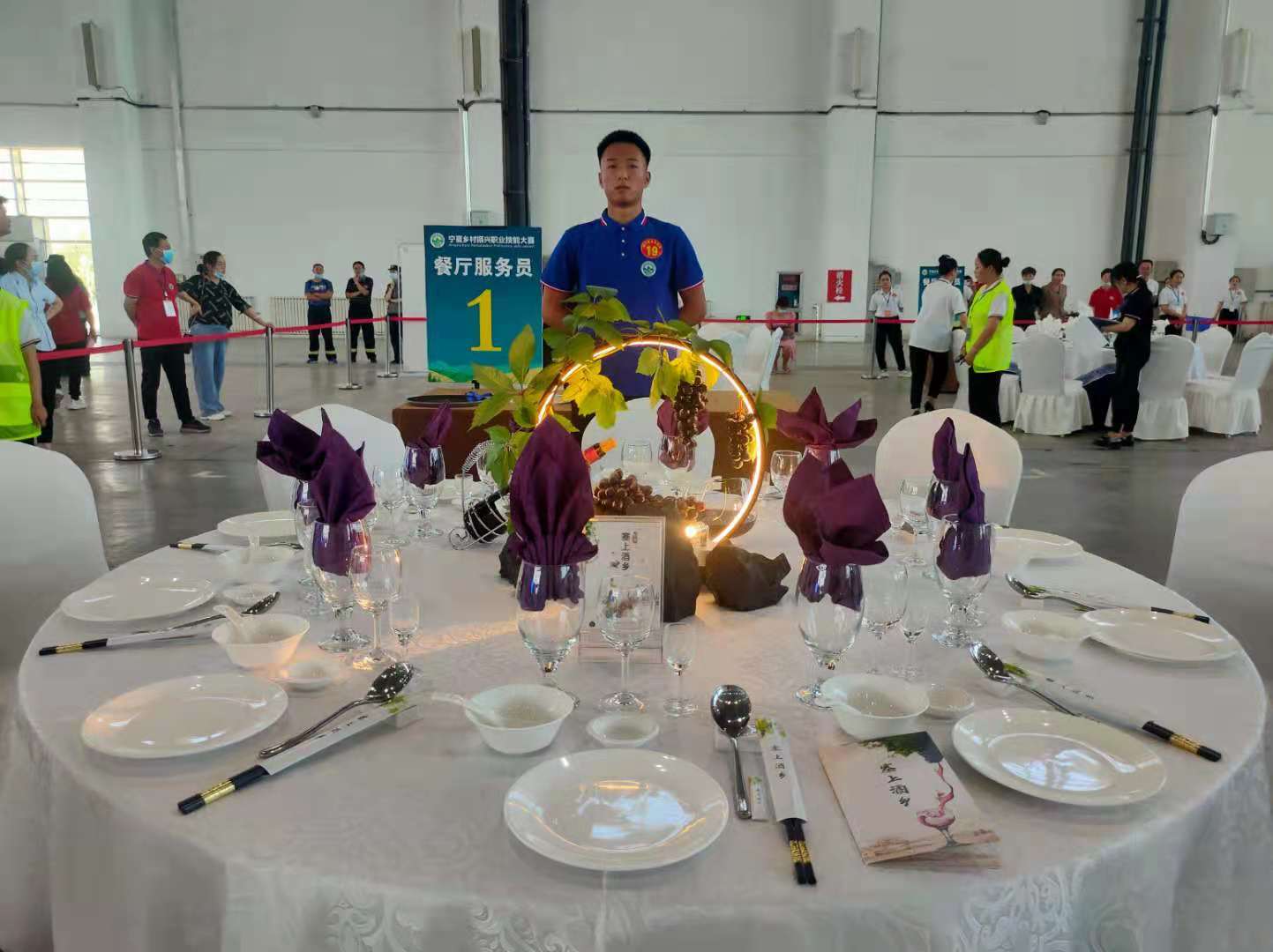 本次大赛共设有砌筑工、育婴员、养老护理员、餐饮服务员、美发师、西式面点师、汽车维修工、农机修理工等8个比赛项目,我校学生代表银川代表队参加餐厅服务员项目。经过紧张备赛,旅游管理学院2020级酒店管理学生幕展望获全区餐厅服务一等奖并获得自治区级“技术能手”称号;其他四名参赛学生2020级酒店管理陈富女、张智荣、乔兴乐、董欢均进入前12名,获优秀奖,王彬华老师获优秀指导教师,李红娟老师获优秀裁判员,袁静老师获优秀工作者,宁夏工商职业技术学院获得特殊贡献奖。