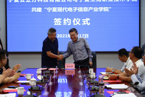 为深入贯彻《国家职业教育改革实施方案》、《自治区深化产教融合推进职业教育改革发展实施方案》等文件精神,9月17日,学校与宁夏云立方科技有限公司共建宁夏现代电子信息产业学院签约仪式在学校隆重举行,校长关世春、副校长原秦英、陈志怀,银川方达电子系统工程有限公司董事长梁明道、副总经理周琦、董炜,宁夏中小在线资信服务有限公司总经理王鲁宁,以及信息技术学院和企业相关领导和老师参加了会议,会议由原秦英副校长主持。