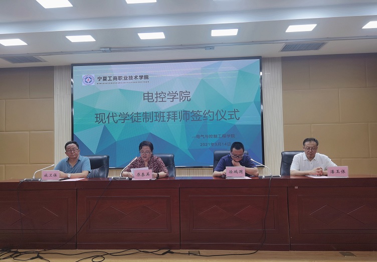2021年9月14日下午,电控学院机电一体化、电气自动化技术专业“现代学徒制”试点专业拜师签约仪式在图书馆报告厅隆重举行。副校长原秦英、电控学院院长施卫保、副院长李辉、杜戈、专业教研室主任及宁夏隆基光伏科技有限公司技术总监徐鹏国、外联经理樊凯、人力资源经理宋丽娟,宁夏小牛自动化设备有限公司副总经理潘玉宝、综合部主任刘荣出席了大会。
