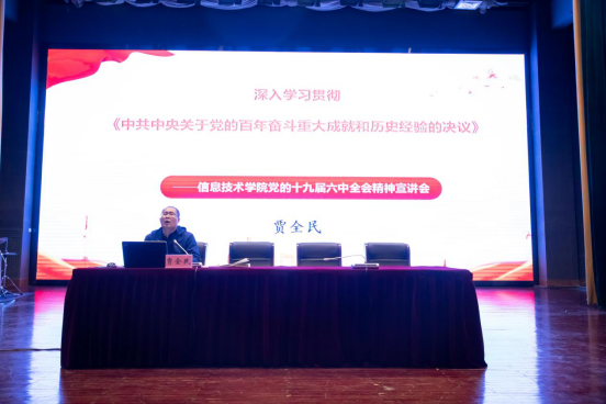 12月8日中午,信息技术学院在大学生活动中心举办了党的十九届六中全会精神宣讲会,党总支书记贾全民为学院500多名师生进行了宣讲。