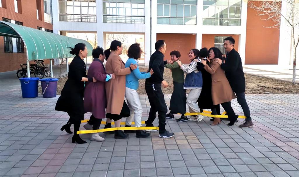 午饭过后,老师们相聚在学院办公楼一楼大厅和门前广场,开展了“信任之旅”、“一分钟抖抖球”及“巨人脚步”等拓展项目活动,活动中老师们以团队形式积极参与,互相协作,完成任务,进一步提升了团队协作精神。