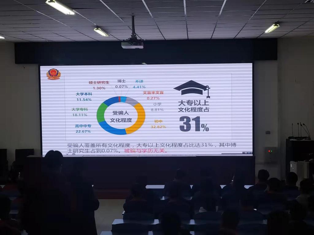 王天宇警官的报告结合众多鲜活案例,从电信诈骗的概念、特点、种类和防范等方面进行了深入浅出的剖析、讲解,通过典型案例、办案实践对防范电信诈骗要点做了阐述。告诫学生虽然社会各界都在很努力的打击诈骗,但是不法分子和违法行为依然存在。同时针对当前犯罪分子借助手机、固定电话、网络等通信工具和他人银行卡、网银技术实施的网络电信诈骗违法活动不断翻新各种花样的现象,民警进一步作了讲解和宣传,使师生们掌握了电信诈骗案件的行骗手段和作案特点,提高了自我防范、自我保护的能力,筑牢师生们防电信诈骗的安全“防火墙”。