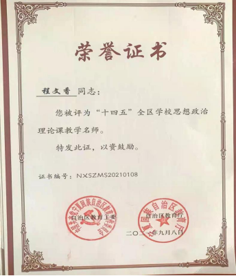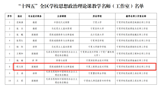 近日,自治区教工委教育厅公布了“十四五”全区学校思想政治理论课教学名师(工作室)名单,马克思主义学院程文香老师荣获“十四五”全区学校思想政治理论课教学名师(工作室)。