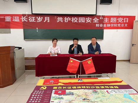 5月11日,财会金融学院“重温长征岁月 共护校园安全”主题党日活动在6号楼103举办,学校党委书记陈晓军出席活动,学院党总支书记董丽华、院长史成泽、专职副书记吴海宽等全体教师党员参加活动。