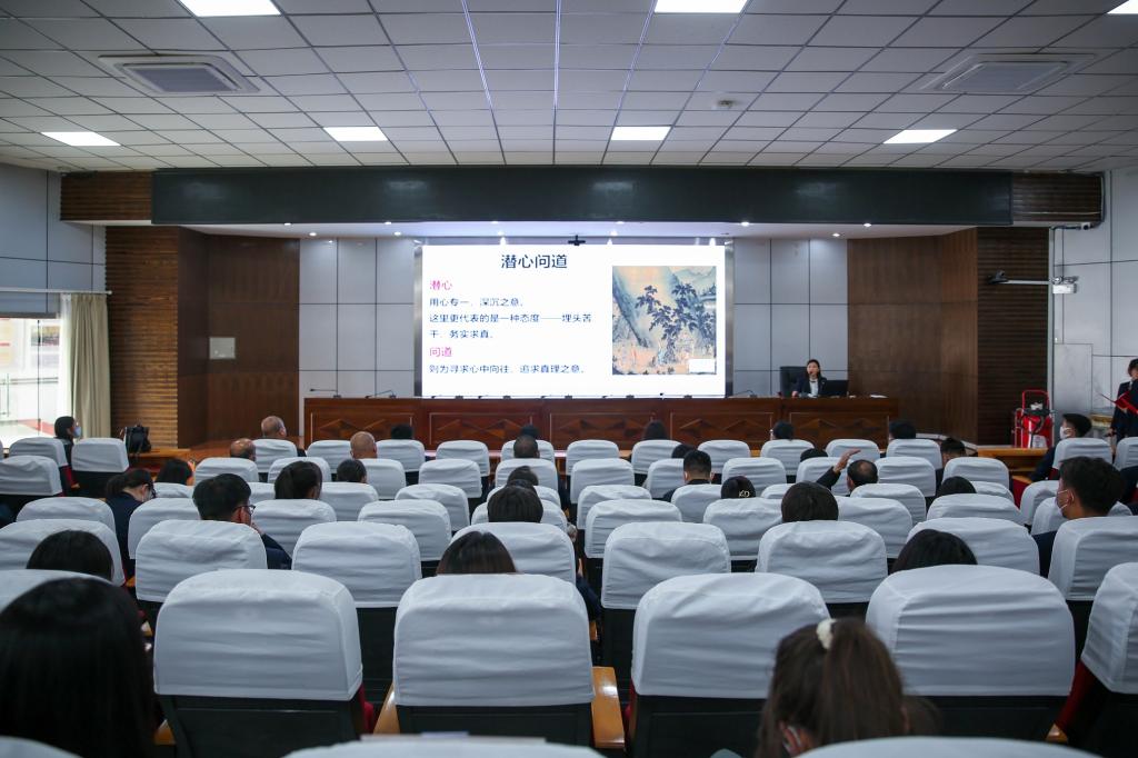 “始于勤,立于本,重于创,敬于业”,在随后的学模范环节中,职业道德先进人物洪家光和2021年度大国工匠人物张路明的故事告诉我们,他们的成功靠的是坚定的信心,靠的是把一件事干到极致的决心,靠的是乐于奉献的工作精神和刻苦钻研的韧劲。最后,马克思主义学院教授吴晓芹老师从为什么要潜心问道,乐于奉献和怎样潜心问道两个方面为在场师生做了生动地讲述。