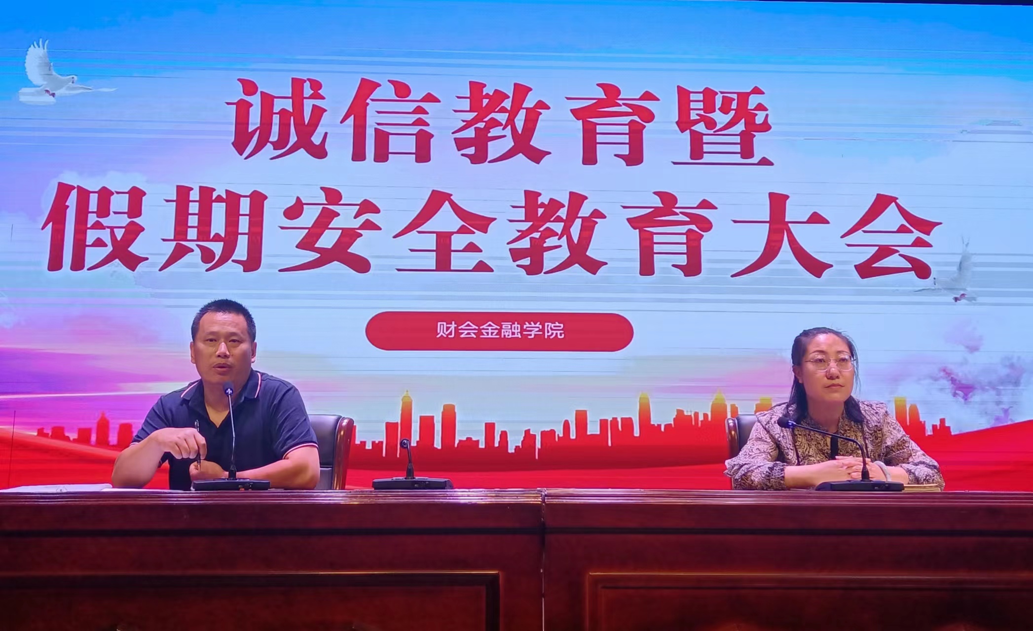 一学期的工作即将收尾,为了确保学生期末诚信考试,加强暑期安全教育,财会金融学院联合保卫处于2022年6月14日在校小剧场召开“诚信暨暑期安全教育”学生大会,副书记吴海宽、副院长叶晓青、学办主任米茹及21级全体师生参加。