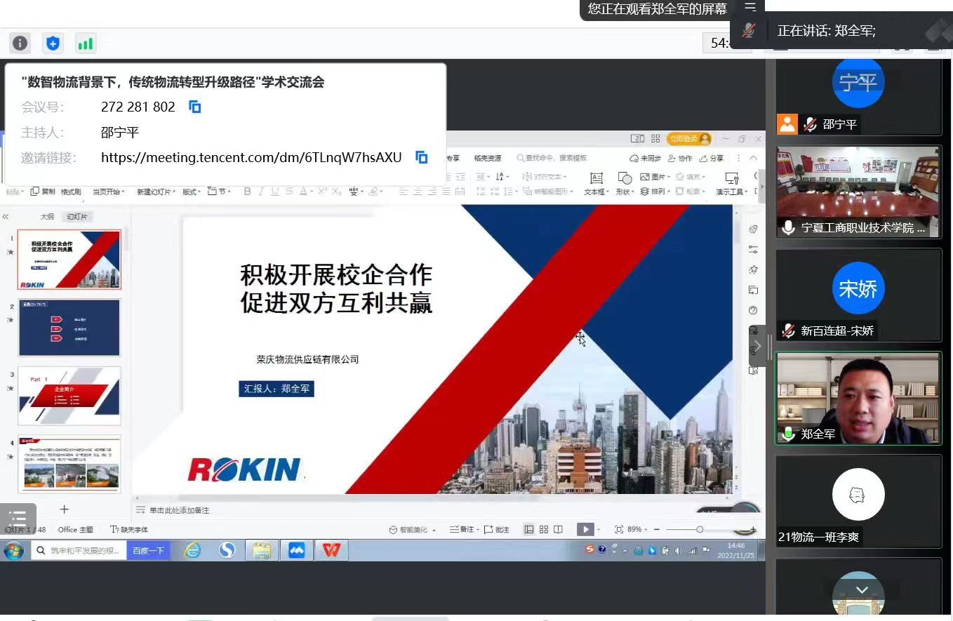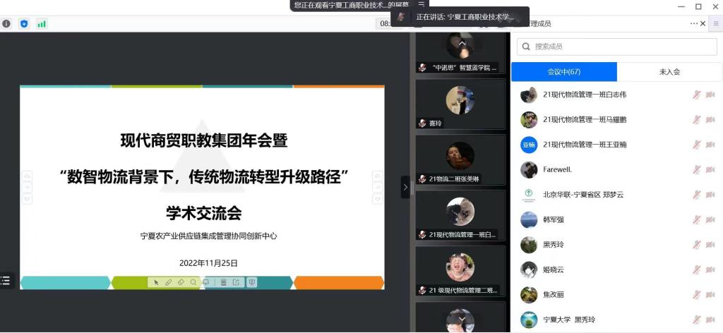 为进一步推动“双高”专业群建设,促进产学研深度合作, 2022年11月25日,商贸学院召开了“2022年度现代商贸职教集团年会暨‘数智物流背景下,传统物流转型升级路径’学术交流会”。本次交流会采用了线上线下相结合方式,会议由商贸学院技术研发中心主任邵宁平和教研室主任杨永光主持,由陈志怀副校长、十余位行业专家及商贸学院领导班子及部分师生参加本次会议。