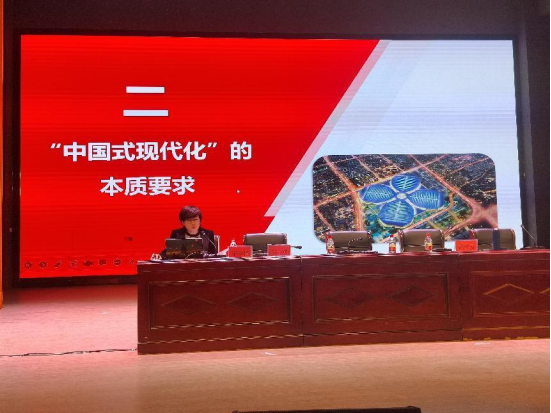 副校长宁晓娟回顾了2022年全校师生在共同抗击疫情、守护校园安全方面取得的成绩。宁校长指出,面对异常严峻的疫情形势,我院教职工、学生迎难而上,勇于担当,形成了抗击疫情中一道靓丽的青春风景线。随后,宁晓娟以“中国式现代化”为主题,从中国式现代化的内涵、本质要求、战略安排、把握原则四个方面向同学们讲解了我国现代化的伟大进程,希望同学们坚定信心、锐意进取,主动识变、应变、求变,主动防范化解风险,为夺取全面建设社会主义现代化国家新胜利贡献力量。